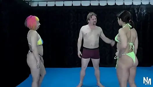 Kontrollieren und zerquetschen, während er in ihren kurzen fitnessstudio-slips oben ohne ist